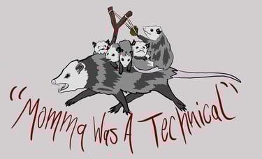 You ever wish you that possums had the means to defend themselves, while also being aware that a fully armed possum population might be too much for humanity to handle? Here's the happy middle ground. Little stinkers with a classic slingshot setup, flinging tactical pinecones at predators and poachers alike. Stickers printer TBD.
